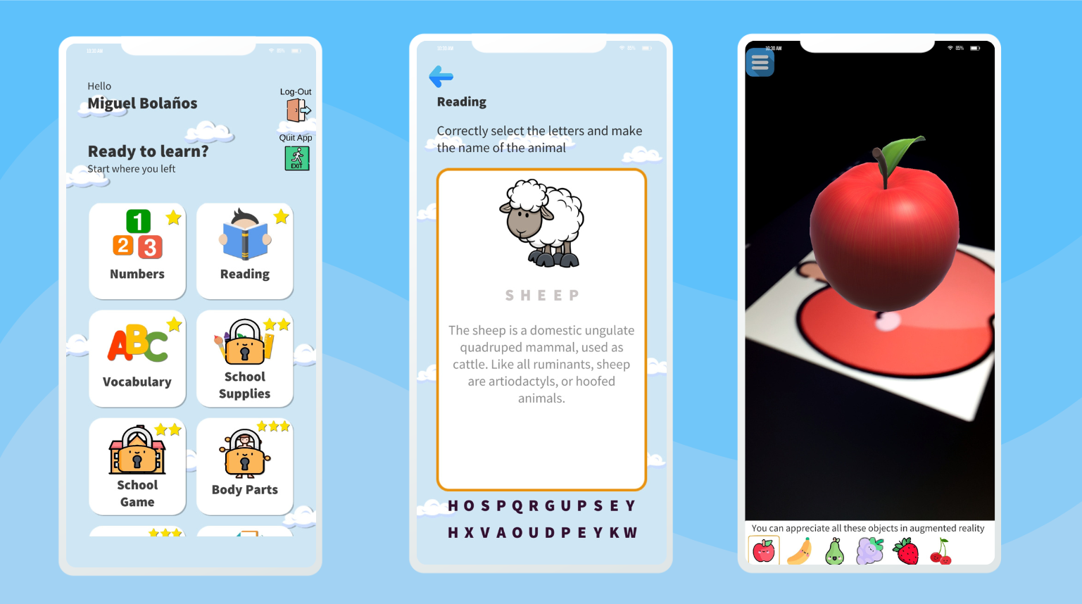 Diseñada para niños de 6 a 14 años, esta plataforma educativa interactiva facilita el aprendizaje del idioma inglés a través de juegos. Incorpora un sistema de Realidad Aumentada con voz integrada para el reconocimiento de objetos y animales, y un sistema de ranking que permite a los docentes monitorear el progreso del alumnado. Desarrollada en Unity con Vuforia para la realidad aumentada y Firebase como backend, utiliza C# como lenguaje de programación.